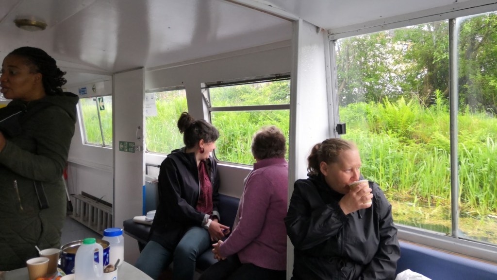 “Then, after tea and coffee, they all started singing. M and A stood up to lead the songs. “R walking with me; walking for equality, she walking with me”. The women use names from the people on the boat in the song. There is a lot of clapping. It’s a singing boat. Walkers on the tow path stop to look at us; they wave. M seems so happy. She sings with passion. Everybody smiles as the songs have all meaning of peace, friendship and hope.” (Field notes)