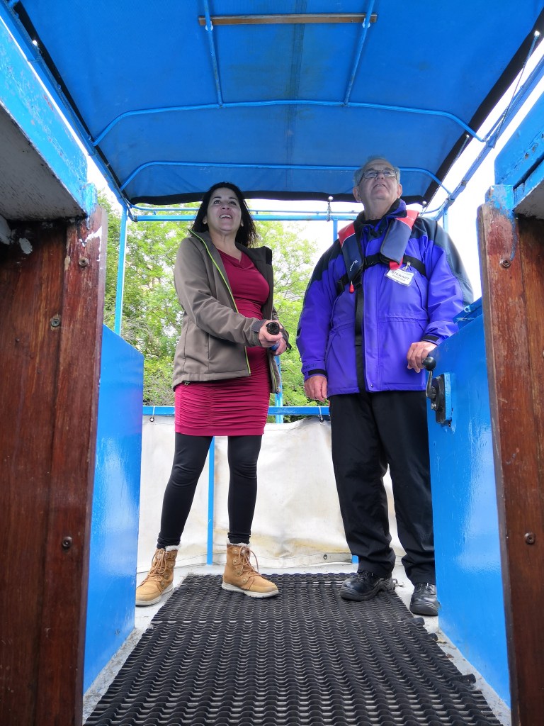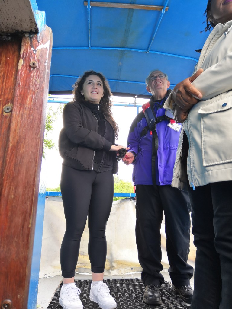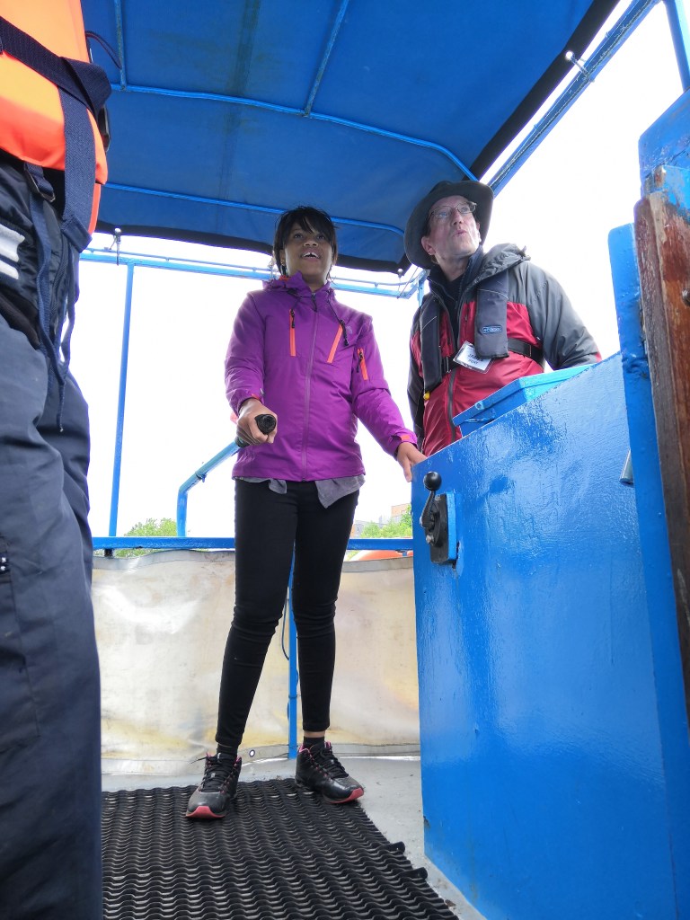 Photographs: Participants had a go at the tiller. They were very curious about how the boat moves and they were surprised as to how much water currents and the wind obstructs the boat movement.
