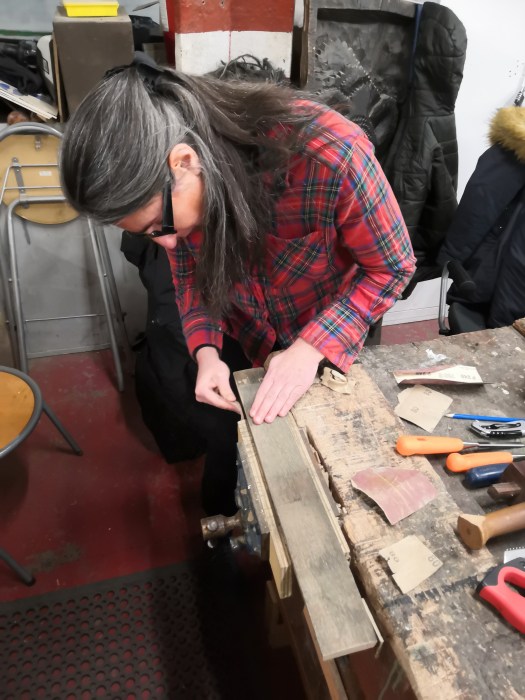 Photographs: From top down: preparing the wood to make a candle-holder in GalGael's wood workshop . Event night in GalGael's workshop. Credits: CanalCraft Participant; Author's own.