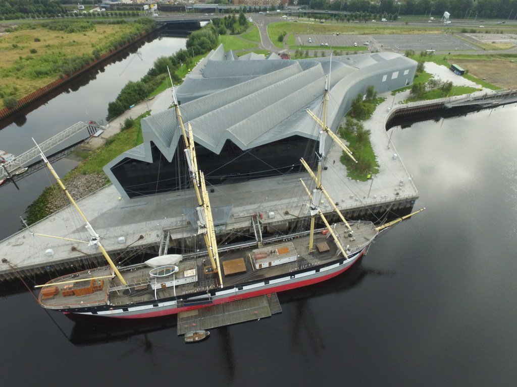 Photograph: This is an aerial photograph from the Clyde Maritime Trust (CMT) photo archive. It shows the Glenlee, the Riverside Museum, and the Riverside space at the north bank of the river Clyde. The Trust is an independent charity and an accredited museum dedicated to restore, preserve and protect The Tall Ship at the Riverside (Glenlee), a historic vessel built in Glasgow in 1896. The CMT's offices and boat-building workshop are located inside the Riverside Museum building. Credit: Clyde Maritime Trust