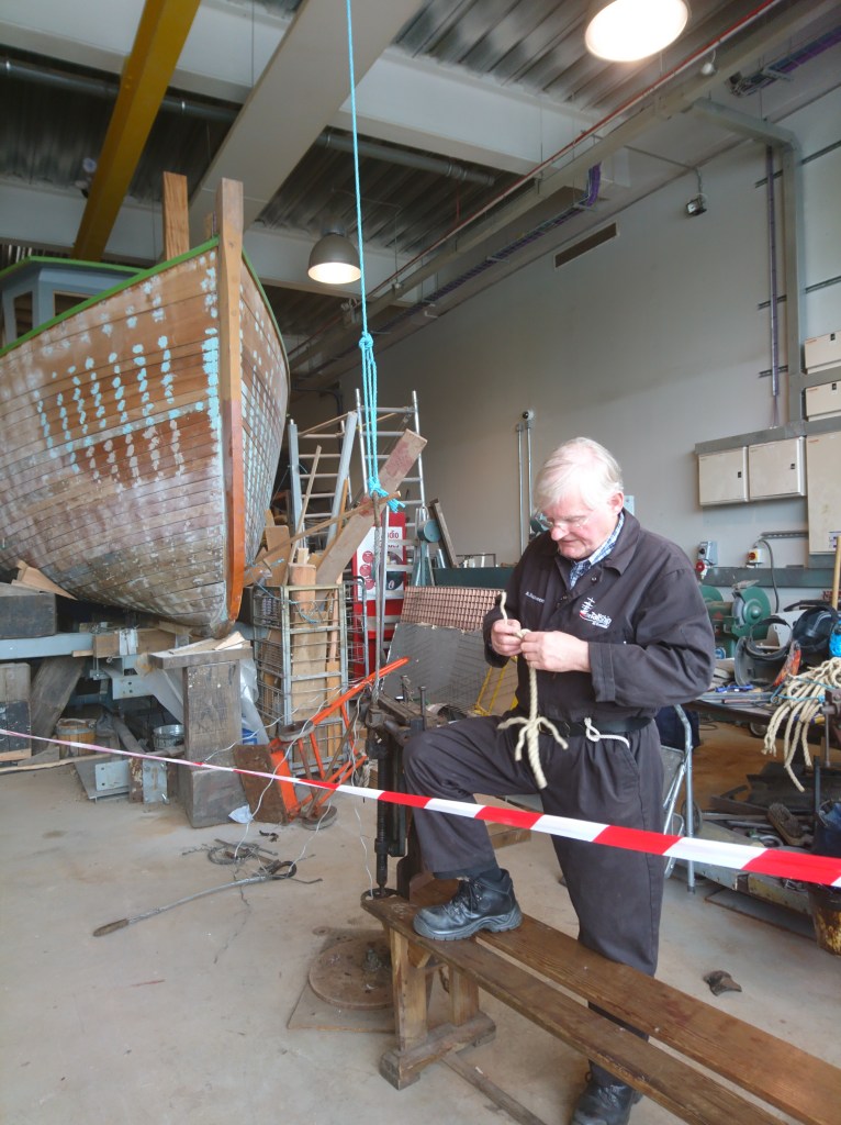 A volunteer in the CMT's workshop showcasing the traditional craft of splicing a rope at an event. Credit: Author's own.