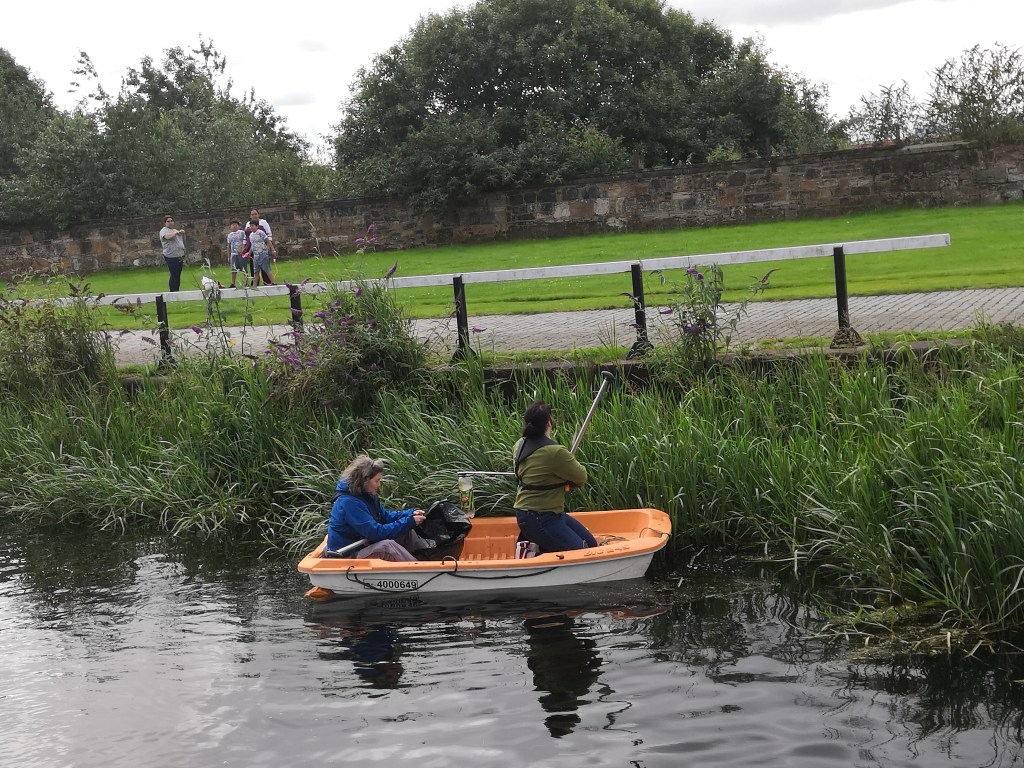 Photographs: FCCS volunteers servicing one of the boats in the Seagull Trust's boathouse. Members of heritage volunteer organisations run heritage walks for groups. Public participation in using traditional boat-building tools during an open day at Lambhill Stables. Volunteers with Scottish Canals on litter picking duties in Maryhill. Learning to tie the rope properly is part of training to navigate boats on the canal. Credit: Author's own.