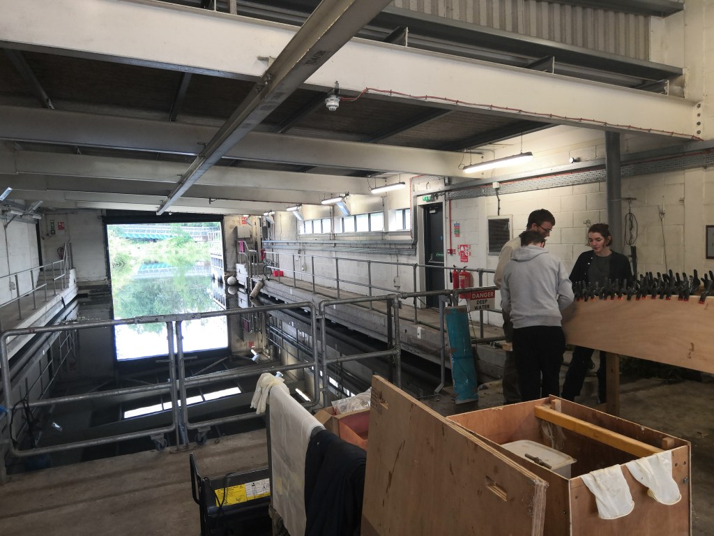 Photograph: Trying out the new boat in the boathouse, boat building workshop, Kirkintilloch.